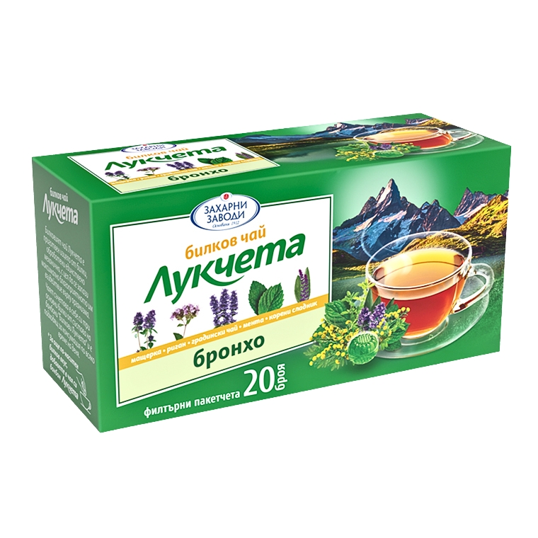Билков чай „Лукчета – Бронхо“ – специална билкова формула за комфортно дишане и приятно усещане в гърлото. Чаят се отличава с наситен билков аромат и балансиран вкус, в който се съчетават свежи, леко пикантни и меки сладки нотки. Подходящ е за консумация през студените месеци, при дискомфорт в гърлото или като част от ежедневната грижа за дихателните пътища. Комбинацията от билки е подбрана така, че да действа меко и приятно, без да натоварва организма.