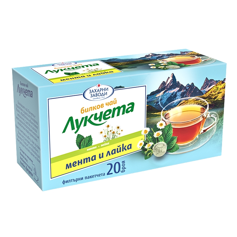 Билков чай „Лукчета“ с мента и лайка – класическа комбинация за спокойствие и комфорт. Чаят се отличава с мек вкус, фин билков аромат и приятно отпускащо действие. Подходящ е за консумация както през деня, така и вечер, когато организмът има нужда от почивка и възстановяване. Комбинацията от мента и лайка го прави универсален избор за цялото семейство и предпочитана напитка в моменти на напрежение или умора.