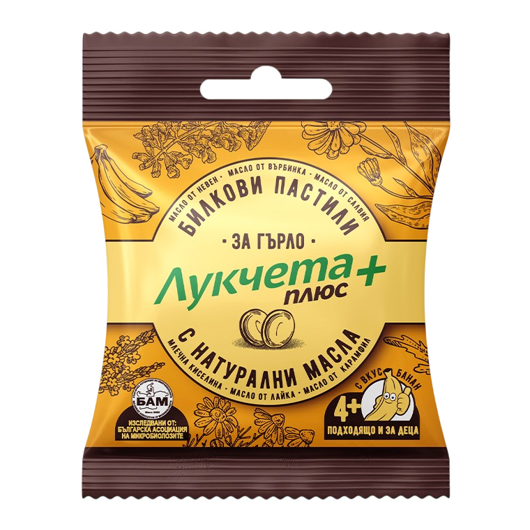 Лукчета Плюс с вкус банан са пастили за гърло с мек вкус и комплекс от билкови масла. В тях влагаме силата на типичните за България билки – лайка, невен, върбинка, салвия и карамфил. Пастилите съдържат още млечна киселина, която засилва ефекта на комплекса и натурален аромат банан.
